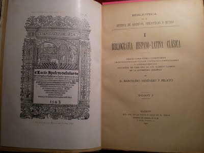Diversas razones, unas irremediables, otras pasajeras, están haciendo que este mes de septiembre no tenga la luz de otros momentos de la vida, ya no digo de otros momentos del año como tal. Espero la vuelta de las clases, este curso entre la Complutense y la Autónoma de Madrid, y me siento cada año un poco más escéptico, ante una universidad cada vez más "pedagógica", que en cierto sentido quiere decir más "infantil". Son circunstancias, es cierto, que hacen que el ánimo no esté en todo su apogeo, pero, como digo, son circunstancias, por lo que hay que pensar en todo aquello que escapa al tiempo y lo transciende. En este sentido, cuando el tiempo es gris, me gusta sentir la emoción de un "nuevo" libro antiguo, libro que sé que ha vivido desde hace más tiempo que yo y que sin duda seguirá existiendo por generaciones. Los estudios sobre la Historiografía de la literatura grecolatina durante la Edad de Plata de la cultura española me han llevado a un libro publicado por Menéndez Pelayo en 1902. Me refiero al primer y único tomo que publicó en vida sobre la Bibliografía Hispano-Latina, publicado en Madrid por la Biblioteca de la Revista de Archivos, Bibliotecas y Museos. Para la mayor parte de los que estudian asuntos relativos a la Tradición Clásica, la obra de Menéndez Pelayo adquiere las dimensiones gigantescas de la llamada "Edición Nacional", llevada a cabo ya entre los años cuarenta y cincuenta del siglo XX por la editorial Aldus y el Consejor Superior de Investigaciones Científicas. Pero merece de verdad la pena navegar y disfrutar de los viejos libros que Menéndez Pelayo publicó en vida, en sus diferentes formatos. En particular, este tomo es una delicia ya desde que se abre, pues nos espera un frontispicio que reproduce la portada de la edición del Asno de Oro publicada en Medina del Campo en 1543. Aquí es donde el observador comienza a darse cuenta de que este libro no está sólo concebido para los especialistas en literatura, sino también para los bibliófilos, y que unos y otros no deberían estar tan escindidos en sus intereses. El historiador de la literatura que no se siente interesado por el libro antiguo se pierde buena parte de la intrahistoria de sus estudios, y el bibliófilo que sólo se dedica a la cinegética o a la tauromaquia se le escapa la propia historia de sus letras. El libro de Menéndez Pelayo nos regala, además, con una definición precisa de lo que es la Tradición Clásica tal y como se concibió desde finales del siglo XIX: "la historia de cada uno de los clásicos en España". La Tradición Clásica es también "Historia literaria", no lo olvidemos, de una literatura, la grecolatina, en otras, las modernas. De entre toda la erudición que se despliega en este tomo quiero destacar dos textos preciosos, debidos al gran maestro de la literatura griega y latina que fue Alfredo Adolfo Camús. En un caso, se trata del sabroso texto de la traducción de un fragmento del poeta Afranio, al que dedicaré otro día mi atención. En el otro, estamos ante un precioso testimonio de bibliófilo que ha rescatado de la desidia un manuscrito dieciochesco que contiene una traducción de Cicerón. Me permito reproducir aquí la ficha de Menéndez Pelayo y el comienzo del texto de Camús: